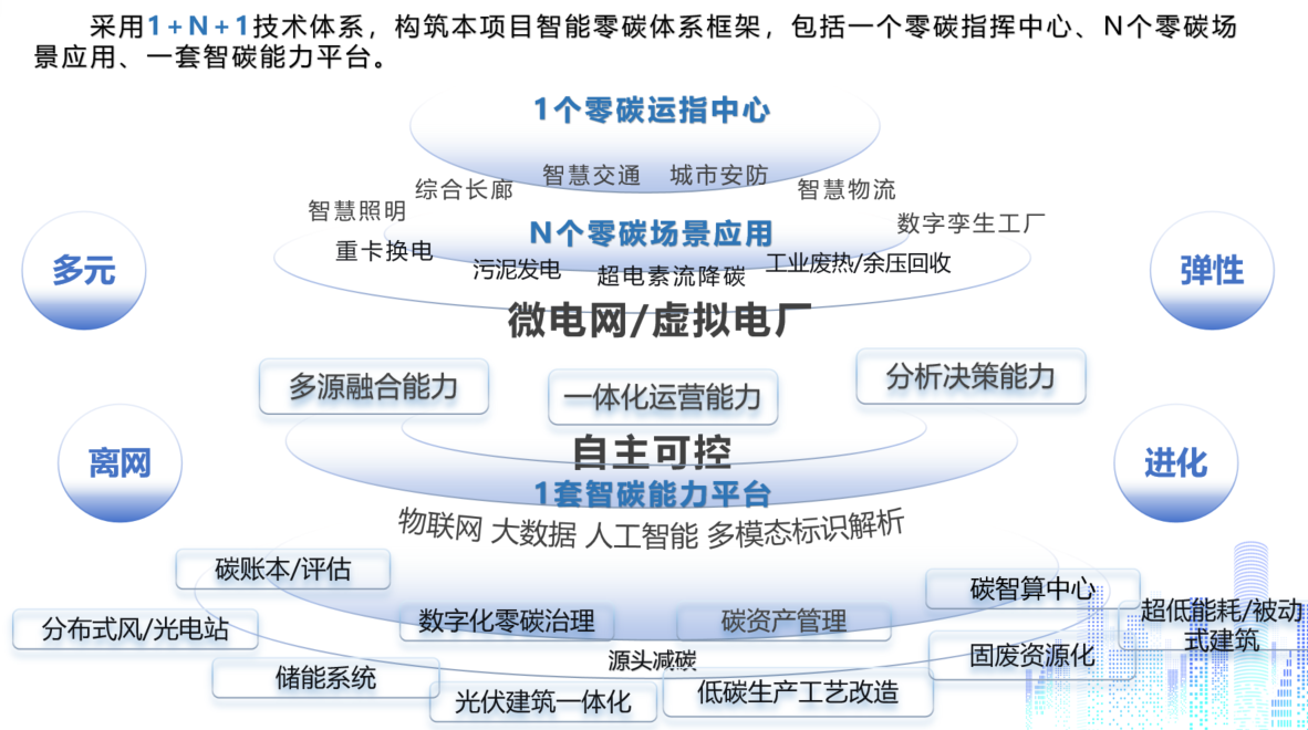 ------------------智慧能碳一体管控,数字赋能零碳园区。-------------------------- 采用1+N+1技术体系,构筑本项目智能零碳体系框架,包括一个零碳指挥中心、N个零碳场景应用、一套智碳能力平台。